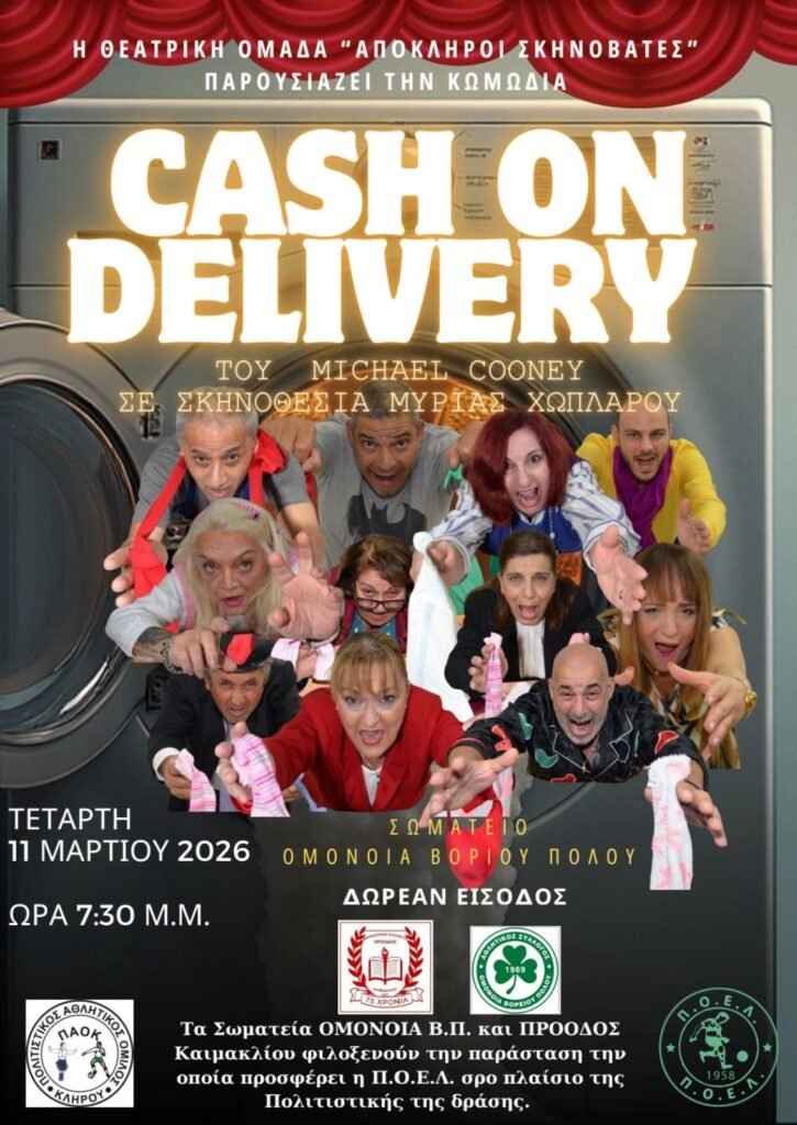 Οι Μορφωτικοί Σύλλογοι ΠΡΟΟΔΟΣ Καϊμακλίου και ΟΜΟΝΟΙΑ Βορείου Πόλου φιλοξενούν την κωμωδία της ερασιτεχνικής θεατρικής ομάδας του ΠΑΟΚ Κλήρου «Απόκληροι Σκηνοβάτες» με τίτλο «Cash on Delivery».
