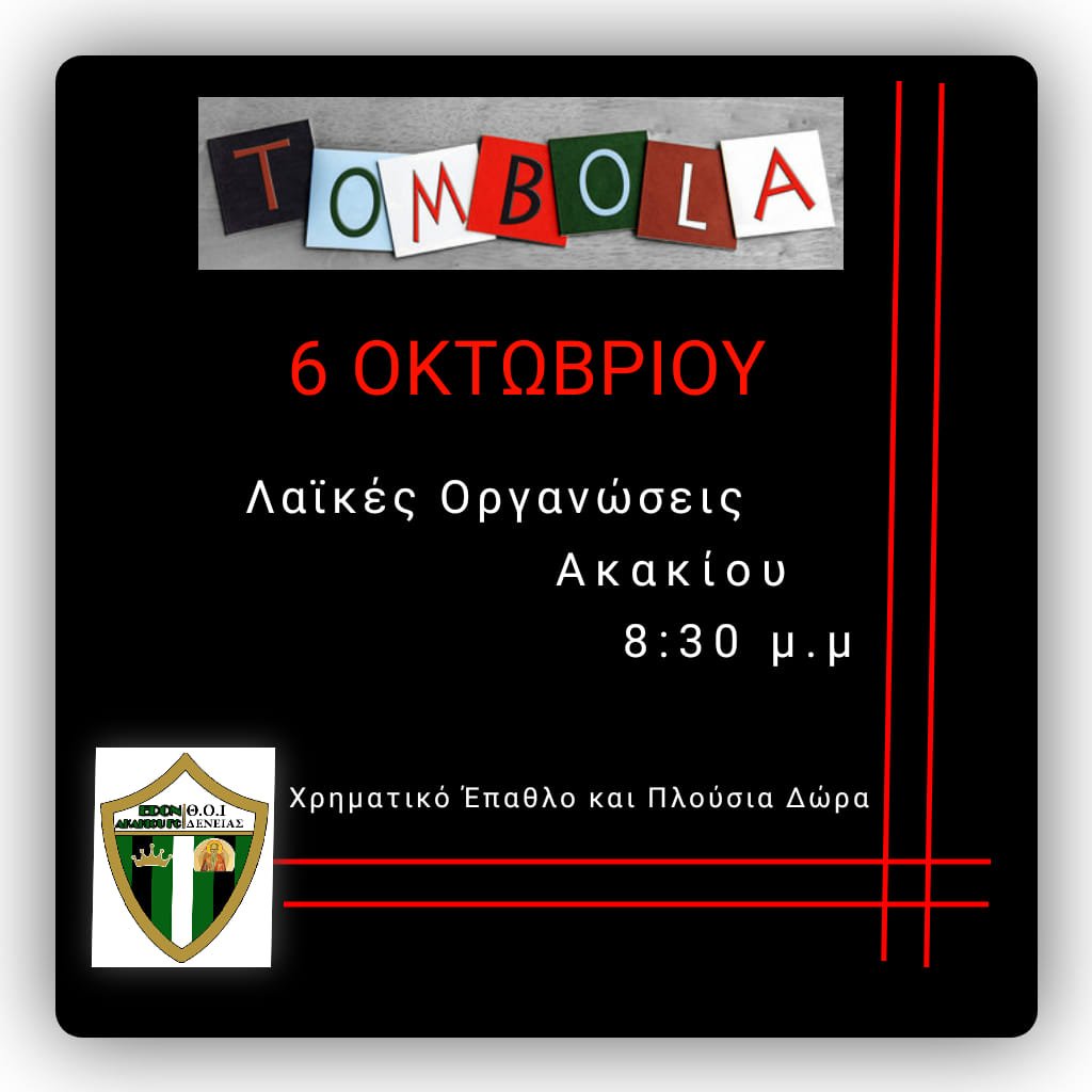Αύριο Παρασκευή, 6 Οκτωβρίου, θα πραγματοποιηθελι η τόμπολα που διοργανώνει η ΕΔΟΝ Ακακίου στις 8:30 στης Λαϊκές Οργανώσεις Ακακίου.