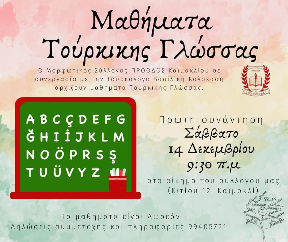 Ο Μορφωτικός Σύλλογος ΠΡΟΟΔΟΣ Καϊμακλίου σε συνεργασία με την Τουρκολόγο Βασιλική Κολοκάση, αρχίζουν μαθήματα τουρκικής γλώσσας.