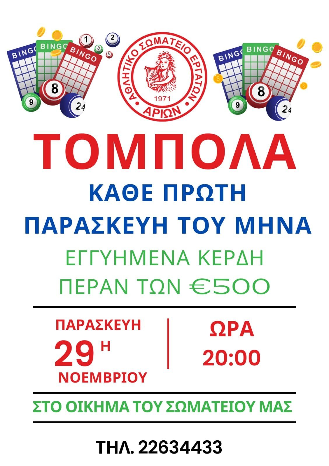 Κάθε πρώτη Παρασκευή του μήνα η τόμπολα του ΑΡΙΩΝ Εργατών