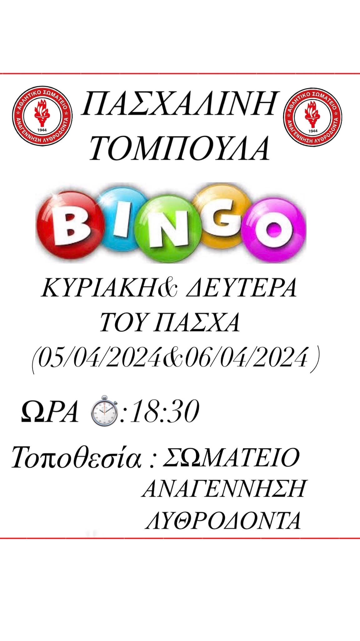Highlights / Top stories / ΝέαΚυριακή & Δευτέρα του Πάσχα η καθιερωμένη τόμπολα της ΑΝΑΓΕΝΝΗΣΗΣ Λυθροδόντα 3 Μαΐου 2024, 17:52 ShareShare Aναλυτικά: ΣΑΣ ΠΕΡΙΜΕΝΟΥΜΕ ΣΤΗΝ ΚΑΘΙΕΡΩΜΕΝΗ ΤΟΜΠΟΛΑ ΤΗΝ ΚΥΡΙΑΚΗ ΚΑΙ ΔΕΥΤΕΡΑ ΤΟΥ ΠΑΣΧΑ ΣΤΟ ΣΩΜΑΤΕΙΟ ΜΑΣ ΔΕΥΤΕΡΑ Η ΩΡΑ 18:30