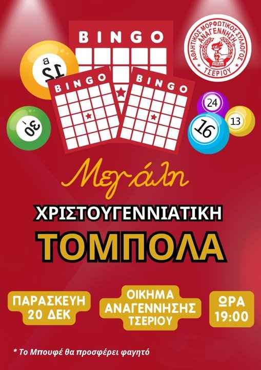 Highlights / Top stories / ΝέαΜεθαύριο Παρασκευή 20/12 η Χριστουγεννιάτικη Τόμπολα της ΑΝΑΓΕΝΝΗΣΗΣ Τσερίου 18 Δεκεμβρίου 2024, 15:49 ShareShare Δείτε αναλυτικά στην πιο κάτω ανάρτηση της ΑΝΑΓΕΝΝΗΣΗΣ όλες τις πληροφορίες που αφορούν στην Χριστουγεννιάτικη Τόμπλα της ομάδας που θα λάβει χώρα μεθαύριο: \
