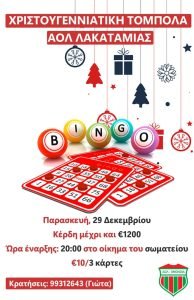 Την Παρασκευή 29/12 θα διεξαχθεί η Χριστουγεννιάτικη τόμπολα του ΑΟΛ Λακατάμιας.