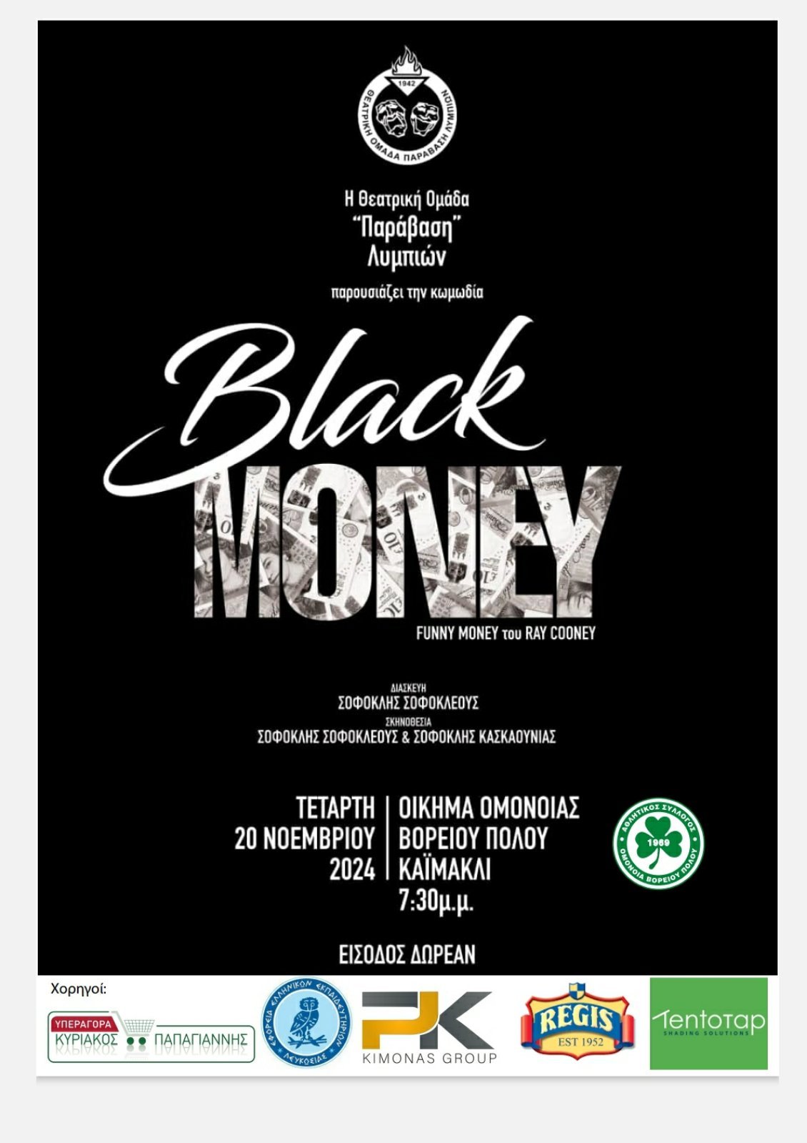 ΟΜΟΝΟΙΑ Β. Πόλου: Την Τετάρτη 20 Νοεμβρίου η θεατρική παράσταση ”Black Money”