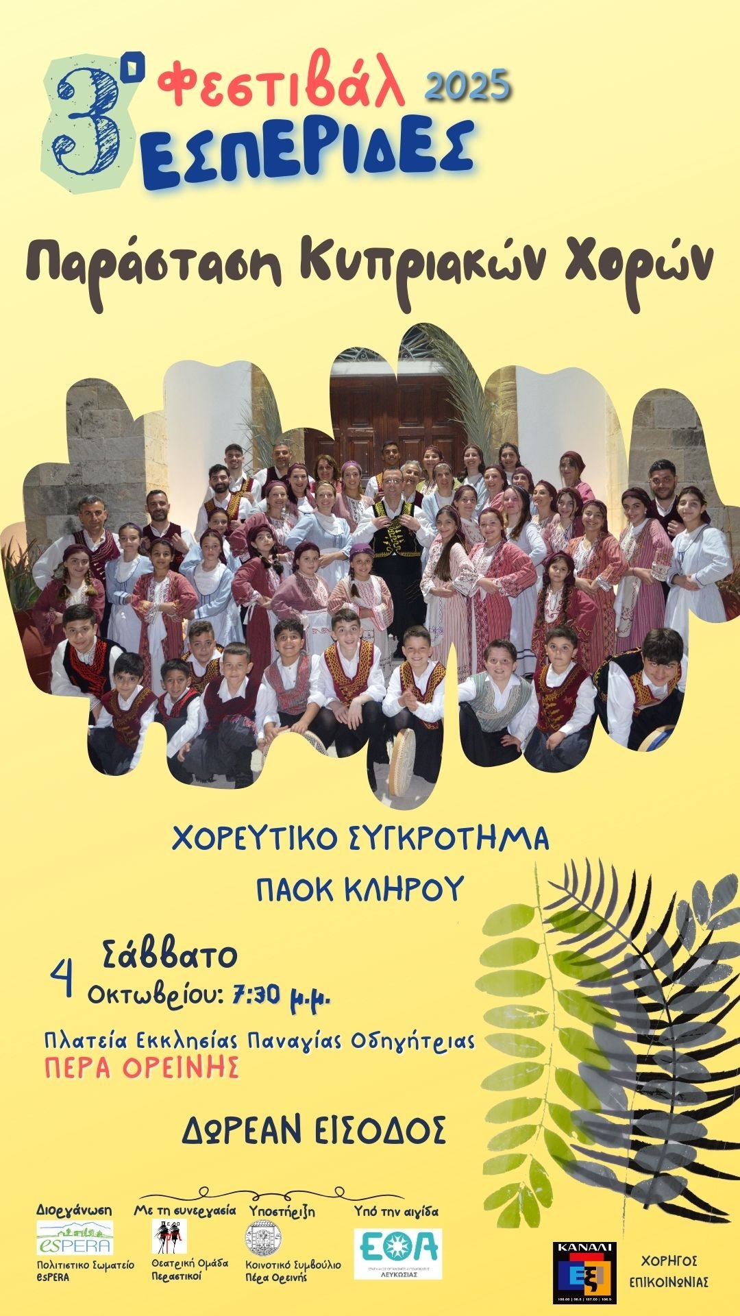 Επιπλέον, το Φεστιβάλ Εσπερίδες το οποίο θα λάβει χώρα το Σάββατο, 4 Οκτωβρίου, στις 7:30 μ.μ. στην Πλατεία Παναγίας Οδηγήτριας στην Κοινότητα Πέρα Ορεινής θα φιλοξενήσει το Χορευτικό Συγκρότημα του ΠΑΟΚ Κλήρου.