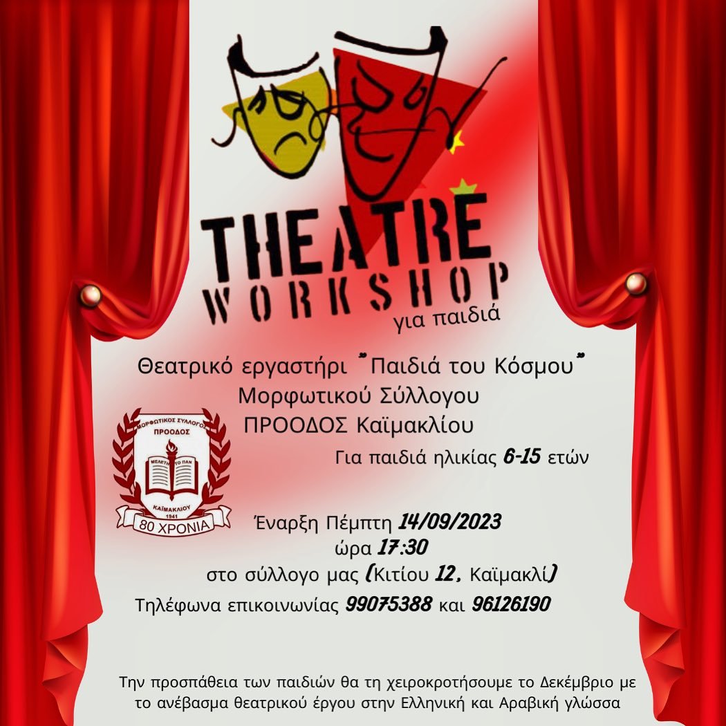 Στο πλαίσιο της πολιτιστικής και πολιτισμικής της δράσης, η ΠΡΟΟΔΟΣ Καϊμακλιου προχώρησε στην δημιουργία του Θεατρικού Εργαστηρίου ”Παιδιά του Κόσμου”. Μέσα από την ομάδα του εργαστηρίου, τα παιδιά θα ενθαρρύνονται για να εκφράζονται ελεύθερα και να αναπτύσσουν την φαντασία τους.