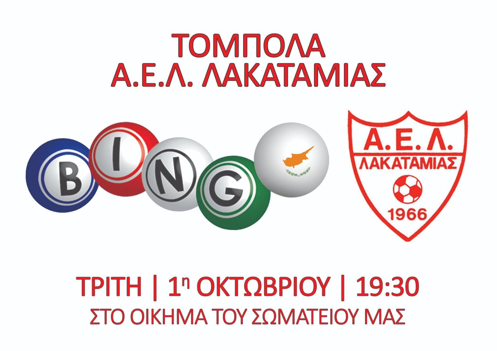 «Σας περιμένουμε την Τρίτη 1η Οκτωβρίου στο οίκημα του σωματείου μας, για οικονομική ενίσχυση της ποδοσφαιρικής μας ομάδας. Στις 19:30 το βράδυ στο οίκημα του σωματείου μας, με πλούσια κέρδη για τους νικητές! Τηλέφωνο κρατήσεων: 22387583»