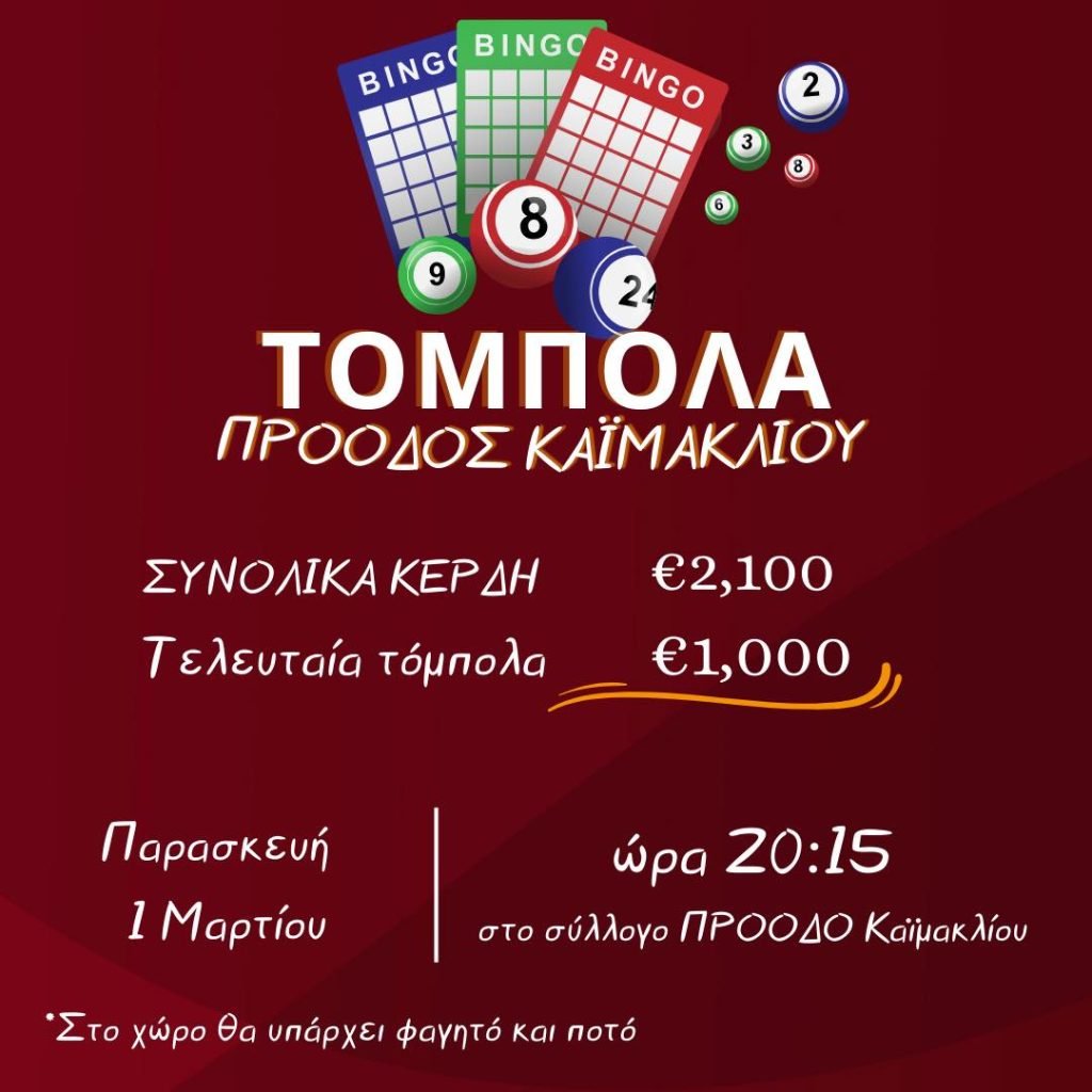 Highlights / Top stories / ΝέαΤην ερχόμενη Παρασκευή, 1 Μαρτίου, η τόμπολα της ΠΡΟΟΔΟΥ Καϊμακλίου 27 Φεβρουαρίου 2024, 15:47 ShareShare Η ΠΡΟΟΔΟΣ Καϊμακλίου, μέσω επίσημης ενημέρωσής της, γνωστοποίησε την πραγματοποίηση τόμπολας την ερχόμενη Παρασκεύη, 1η Μαρτίου, στο οίκημα του Σωματείου στις 20:15. Αναλυτικά, όλες οι σχετικές πληροφορίες: