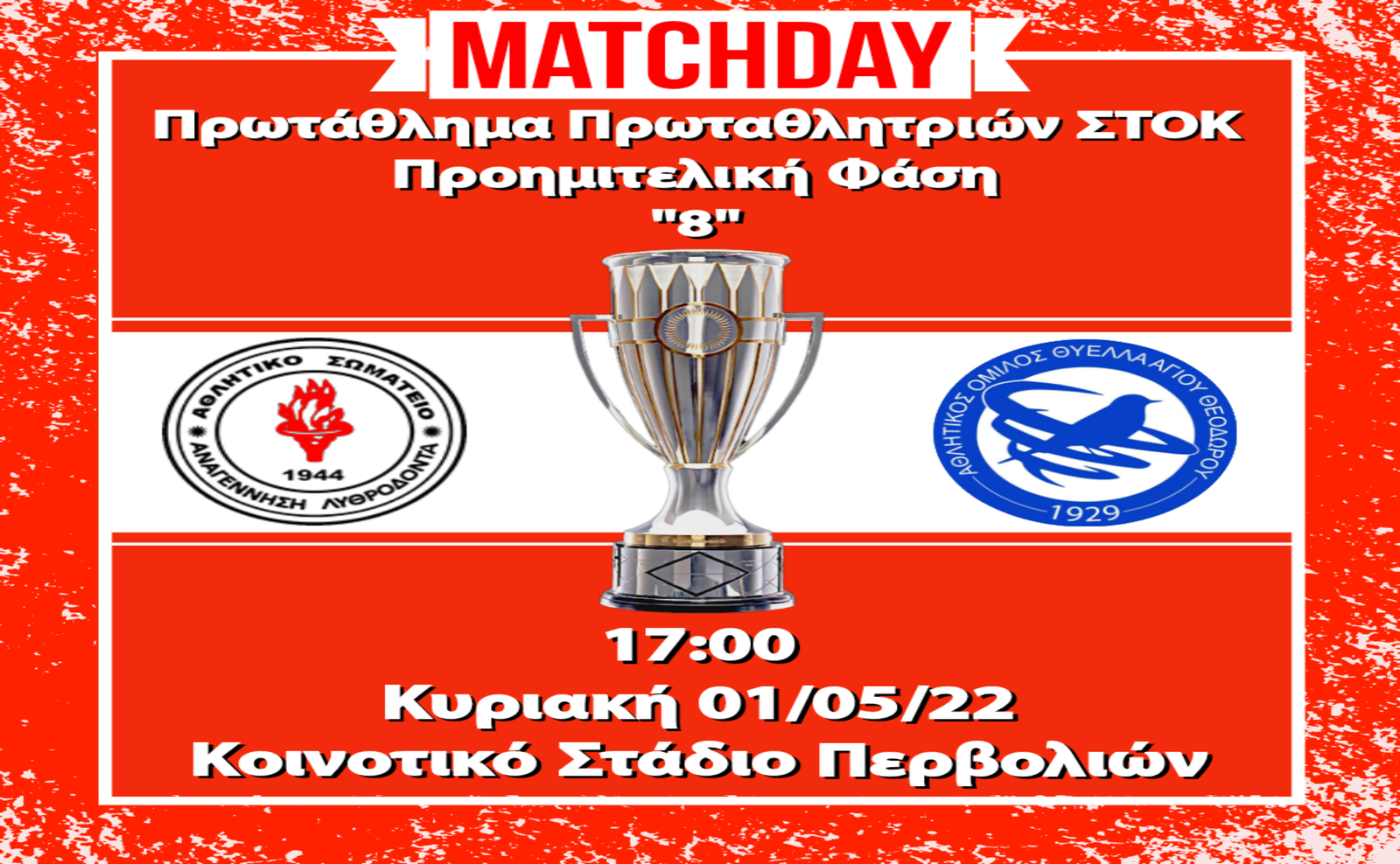 Η εκπρόσωπος της Ομοσπονδίας μας Αναγέννηση Λυθροδόντα αγωνίζεται την Κυριακή 01/05 κόντρα στην Πρωταθλήτρια ομάδα της ΕΠΕΛ – ΣΕΚ – ΠΟΕΠΑ, Θύελλα Αγίου Θεοδώρου. Ο αγώνας θα διεξαχθεί στα πλαίσια της Προημιτελικής φάσης του Πρωταθλήματος Πρωταθλητριών της ΣΤΟΚ. Ο αγώνας έχει οριστεί στο Κοινοτικό Στάδιο Περβολιών και θα αρχίσει στις 17:00.