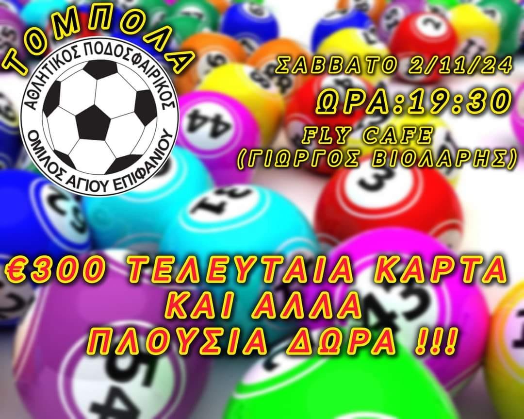 Μέσω επίσημης ενημέρωσής του, ο Αθλητικός Ποδοσφαιρικός Όμιλος Αγίου Επιφανίου, γνωστοποιεί πως το Σάββατο 2 Νοεμβρίου θα διοργανώσει τόμπολα.
