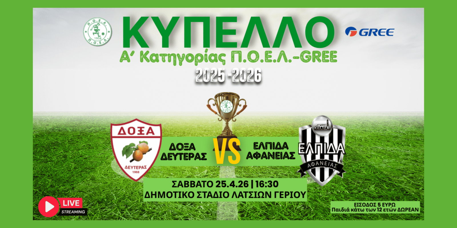 Για όσους δεν καταφέρουν να βρεθούν στο γήπεδο, ο τελικός θα μεταδοθεί ζωντανά (live streaming), δίνοντας τη δυνατότητα σε όλους να παρακολουθήσουν τη μεγάλη μάχη για την κατάκτηση του Κυπέλλου. Ένα παιχνίδι με πάθος, ένταση και υψηλό ανταγωνισμό, που δεν πρέπει να χάσει κανείς.
