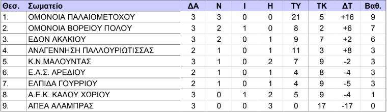 Δείτε πως διαμορφώνεται η βαθμολογία στο Πρωτάθλημα Β’ Κατηγορίας ΠΟΕΛ – GREE μετά και το πέρας 3 αγωνιστικών. Η ΟΜΟΝΟΙΑ Παλιομετόχου οδηγεί την ”κούρσα” με 9 βαθμούς και το απόλυτο των νικών ενώ στην δεύτερη θέση βρίσκεται η ΟΜΟΝΟΙΑ Βορείου Πόλου με 7 βαθμούς παραμένοντας μάλιστα και αυτή αήττητη και έχοντας την καλύτερη άμυνα με μόλις δύο γκολ παθητικό.