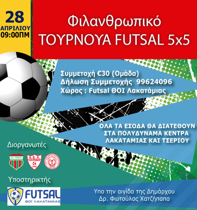 Το ΔΣ της ΠΟΕΛ θα ήθελε να συγχαρεί τα σωματεία ΑΕΛ Λακατάμιας, ΑΟΛ Λακατάμιας και ΑΝΑΓΕΝΝΗΣΗ Τσερίου για την πρωτοβουλία τους να διοργανώσουν φιλανθρωπικό τουρνουά futsal δίνοντας όλα τα έσοδα στα πολυδύναμα κέντρα Λακατάμιας και Τσερίου.