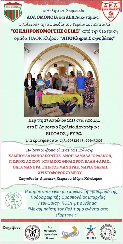 Μεθαύριο, τα σωματεία ΑΟΛ Λακατάμιας και AEΛ ΛΑΚΑΤΑΜΙΑΣ μέσα στα πλαίσια και της δικής τους πολιτιστικής προσφοράς παρουσιάζουν την θεατρική παράσταση ” Οι κληρονόμοι της θειας” από τη θεατρική ομάδα του ΠΑΟΚ Κλήρου.