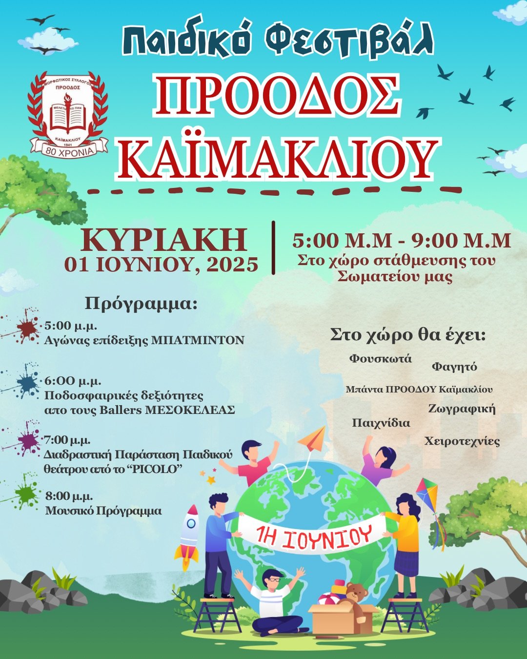 Την Κυριακή 1η Ιουνίου, Παγκόσμια Μέρα του Παιδιού, η ΠΡΟΟΔΟΣ Καϊμακλίου διοργανώνει παιδικό φεστιβάλ από τις 17:00 μέχρι τις 21:00 στον χώρο στάθμευσης του Σωματείου της.